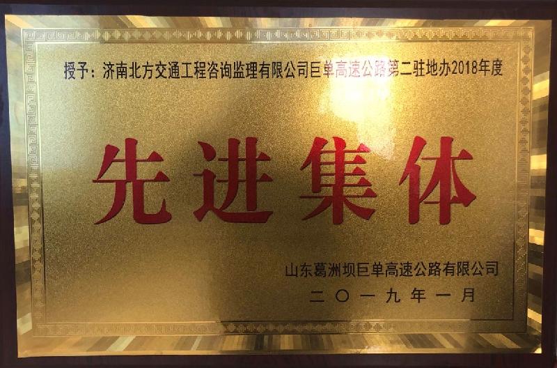 2019年1月23日,山东葛洲坝巨单高速公路有限公司召开了2018年度评优评先活动表彰大会,济南北方交通工程咨询监理有限公司巨单高速公路第二驻地办荣获“先进集体”荣誉称号,公司申士领、吴京波、战祥亮、张士锋四位同志分别获得“优秀监理工程师”称号。