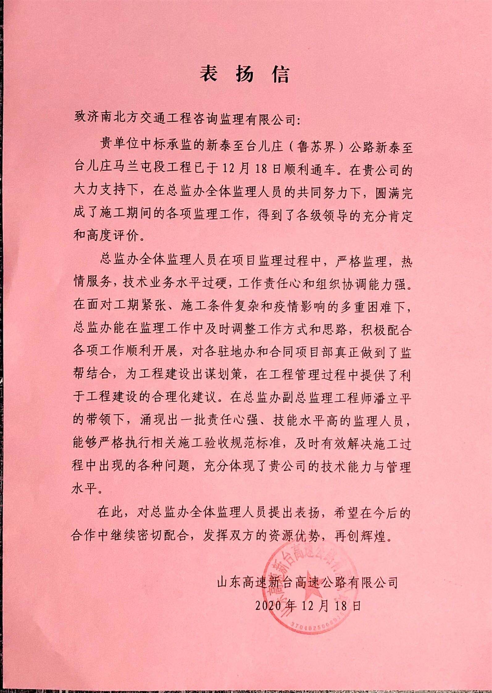 近日,我公司承监的新泰至台儿庄(鲁苏界)公路新泰至台儿庄马兰屯段工程已于12月18日顺利通车,该工程建成得到了各级领导的充分肯定和高度评价,山东高速新台高速公路有限公司特向公司发来了表扬信,信中对新台高速总监办我司监理人员在面对工期紧张、施工条件复杂和疫情影响的多重困难下,能够及时调整工作方式和思路,积极配合各项工作顺利开展,为工程建设出谋划策,圆满完成了施工期间的各项监理工作,给予了高度的赞扬和诚挚的感谢,信中特别提出了新台高速总监办副总监理工程师潘立平带领我司监理人员严格执行相关施工验收规范标准,及时有效解决施工过程中出现的各种问题,并对其工作成绩做出了充分肯定。