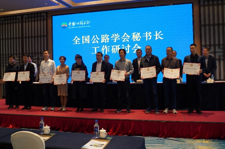 会议期间,对全国公路学会2020年度优秀秘书长进行了表彰,中国公路学会翁孟勇理事长为我公司总经理石磊同志颁发了“2020年度中国公路学会优秀秘书长”奖状和证书。