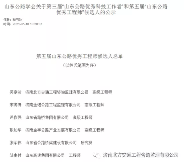 近日,山东公路学会下发《关于第三届“山东公路优秀科技工作者”和第五届“山东公路优秀工程师”候选人的公示》的通知,我公司吴京波同志被授予“山东公路优秀工程师”荣誉称号。