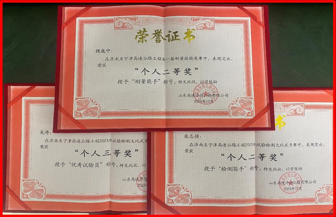 近日,济南至宁津高速公路第一驻地办在山东高速济德公路有限公司和总监办举办的“2023年试验测量大比武”和“第一届测量技能竞赛”活动中斩获佳绩,分别获得了团体和个人等多个奖项。