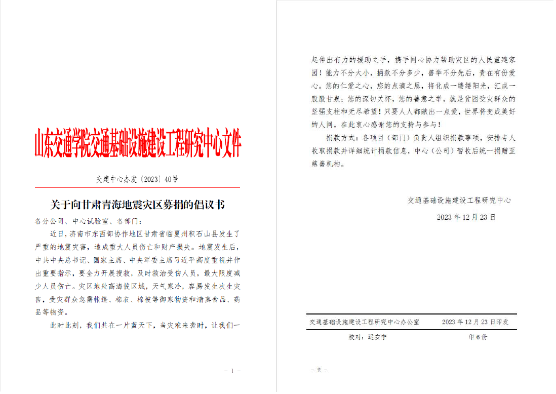 地震无情,人间有爱。为迅速贯彻落实习近平总书记对甘肃省临夏州积石山县6.2级地震作出的重要指示精神,积极帮助济南市的东西部协作地区--积石山县地震灾区群众尽快渡过难关重建家园,中心第一时间发布了募捐倡议书,组织全体干部和职工开展了捐款活动以实际行动为灾区人民送去温暖和关爱。