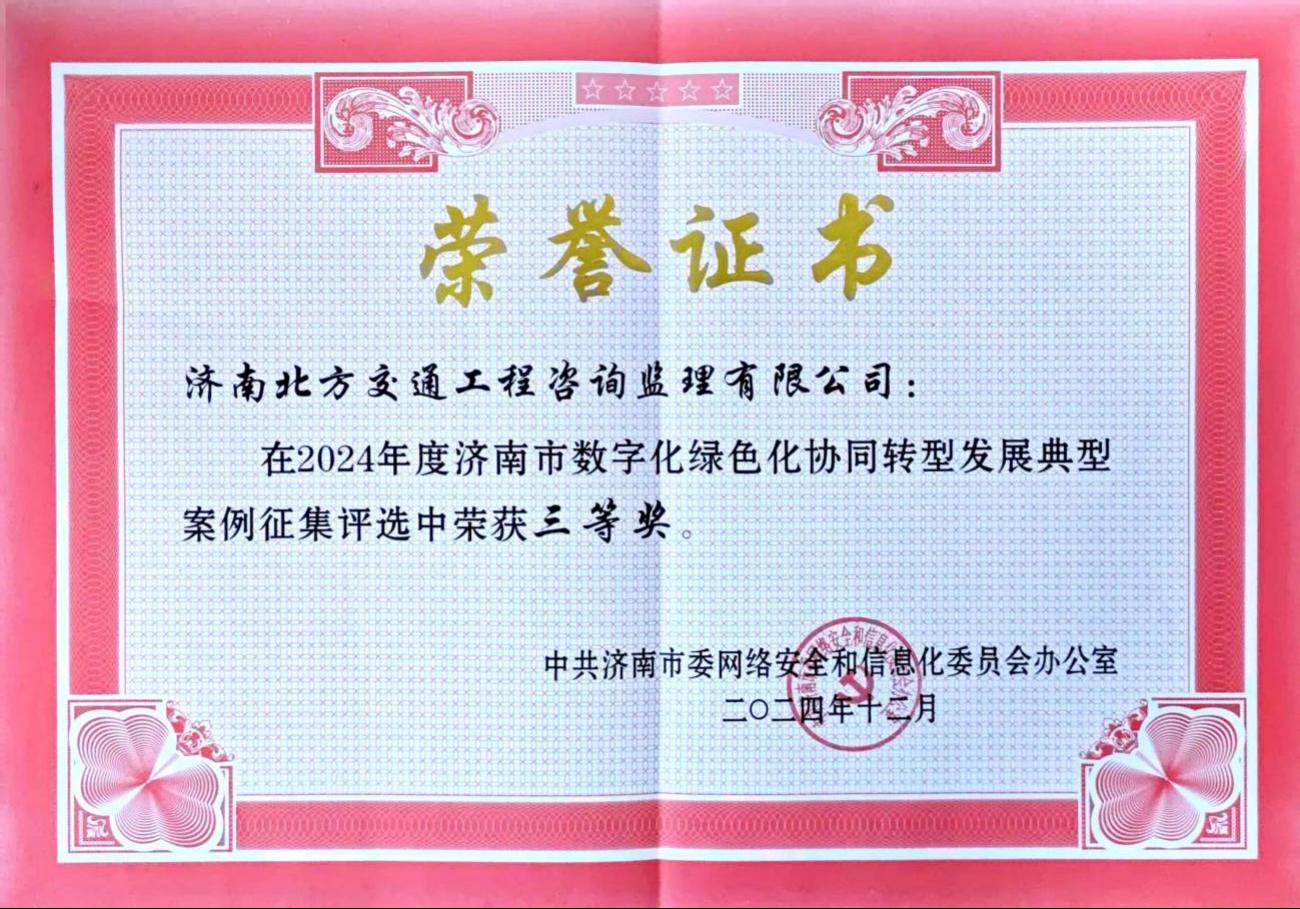 中心(济南北方交通)荣获2024年度济南市数字化绿色化协同转型发展典型案例三等奖
