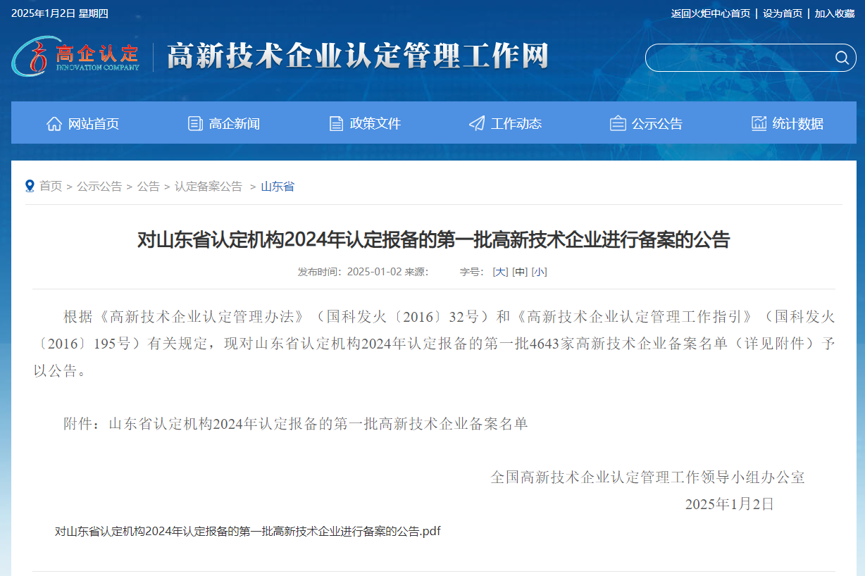 近日,全国高新技术企业认定管理工作领导小组办公室发布了2024年山东省认定报备的第一批高新技术企业备案名单,经自行申报、地方初审、专家审查、公示公告等严格申报程序,中心(济南北方交通)顺利通过高新技术企业复审,再次被认定为高新技术企业。