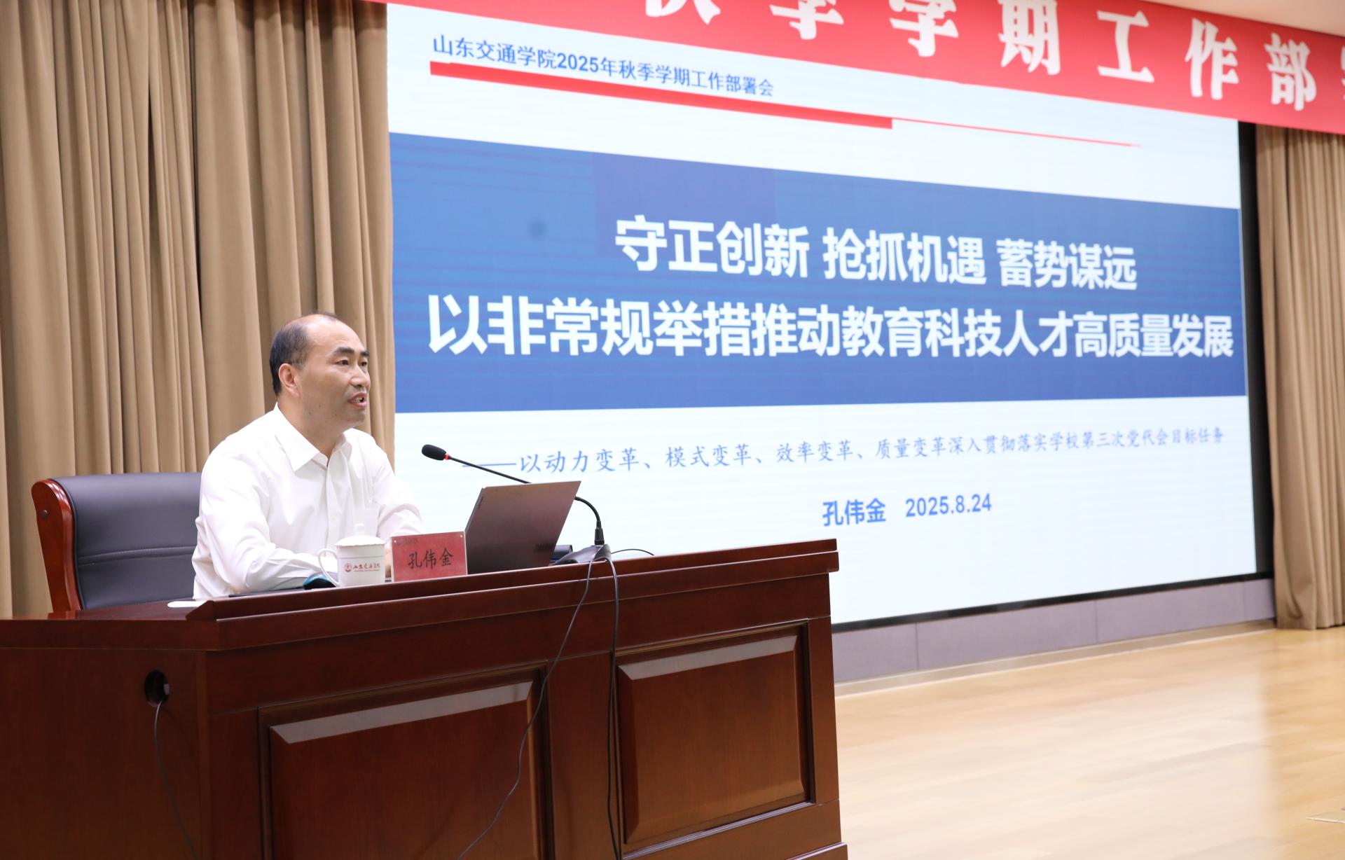 学校党委副书记、院长孔伟金就上半年工作作总结,并部署新学期主要工作。他以《守正创新 抢抓机遇 蓄势谋远 以非常规举措推动教育科技人才高质量发展》为题,从进展与成绩、方位与形势、目标与任务三个方面系统总结回顾了上半年和暑期主要工作,全面剖析了当前形势,进一步明确了推动学校高质量发展的各项措施,并对2025年下半年重点任务进行规划部署。他强调,全校上下要紧紧围绕高水平大学建设目标,扎实推进卓越交通人才培养、科技创新、人才引育、“十五五”发展规划编制与学科学位点建设等各项重点工作,发扬“逢山开路、遇水架桥”的交通人精神,抢抓机遇、勇于担当、追求卓越,奋力书写学校高质量发展的崭新篇章。