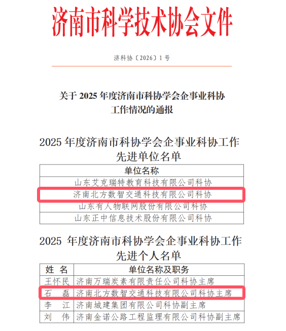 近日,济南市科学技术协会印发《关于2025年度济南市科协学会企事业科协工作情况的通报》(济科协〔2026〕1号),公司获评“2025年度济南市科协学会企事业科协工作先进单位”,中心主任、公司董事长石磊获“2025年度济南市科协学会企事业科协工作先进个人”荣誉称号。