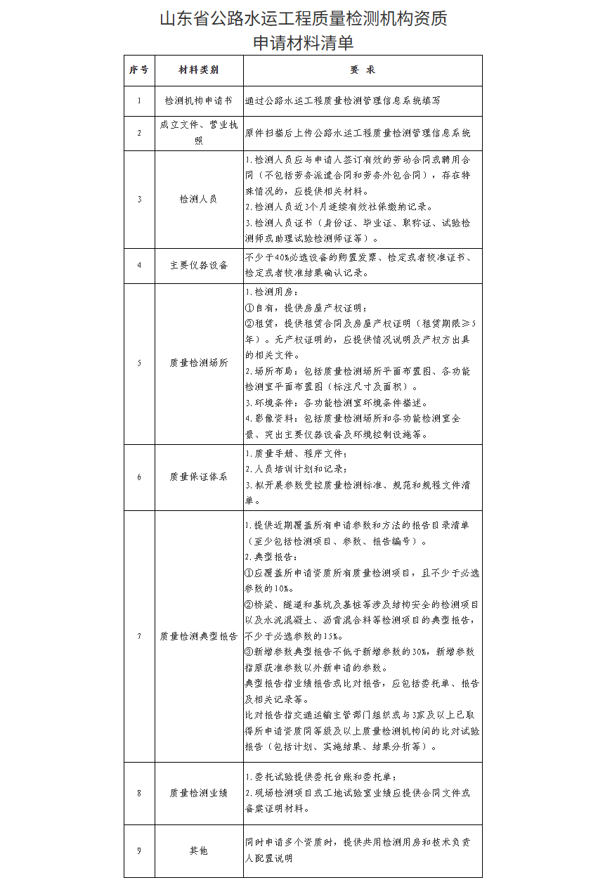 附件:1.山东省公路水运工程质量检测机构资质申请材料清单